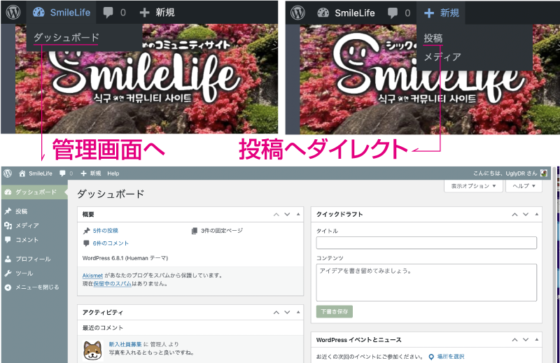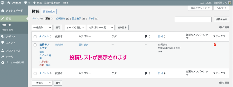サイトの利用方法 お知らせ 공지 2025.06.192025.06.20 1.登録されたID、パスワードでログインしてください。 <ログイン後の画面> 2.管理画面<ダッシュボード> 投稿、写真(メディア)、プロフィールなどはここで管理します。3.投稿 <投稿画面>一般的なブログと同じような仕様です。アイキャッチはトップ画面に表示される写真ですので、必ず入れてください。もし入れなければグレーで表示されます。カテゴリは必ず選択してください。 7.スマホからも投稿できます。仕様は同じです。